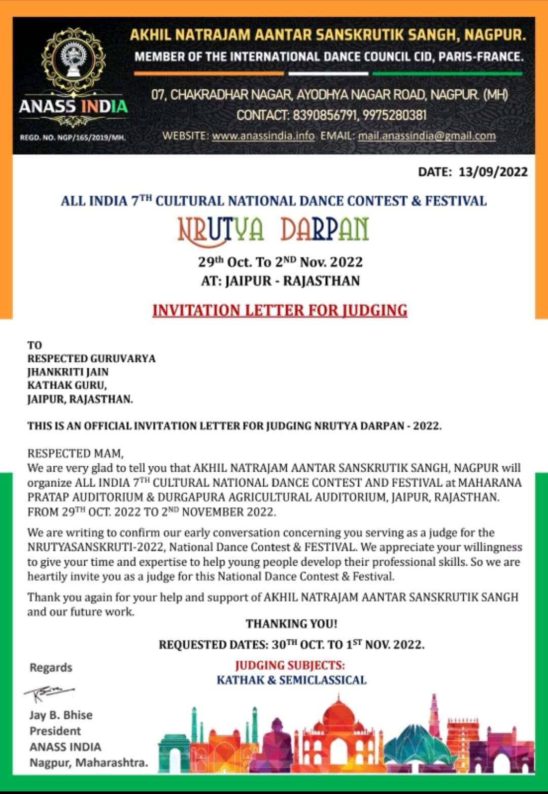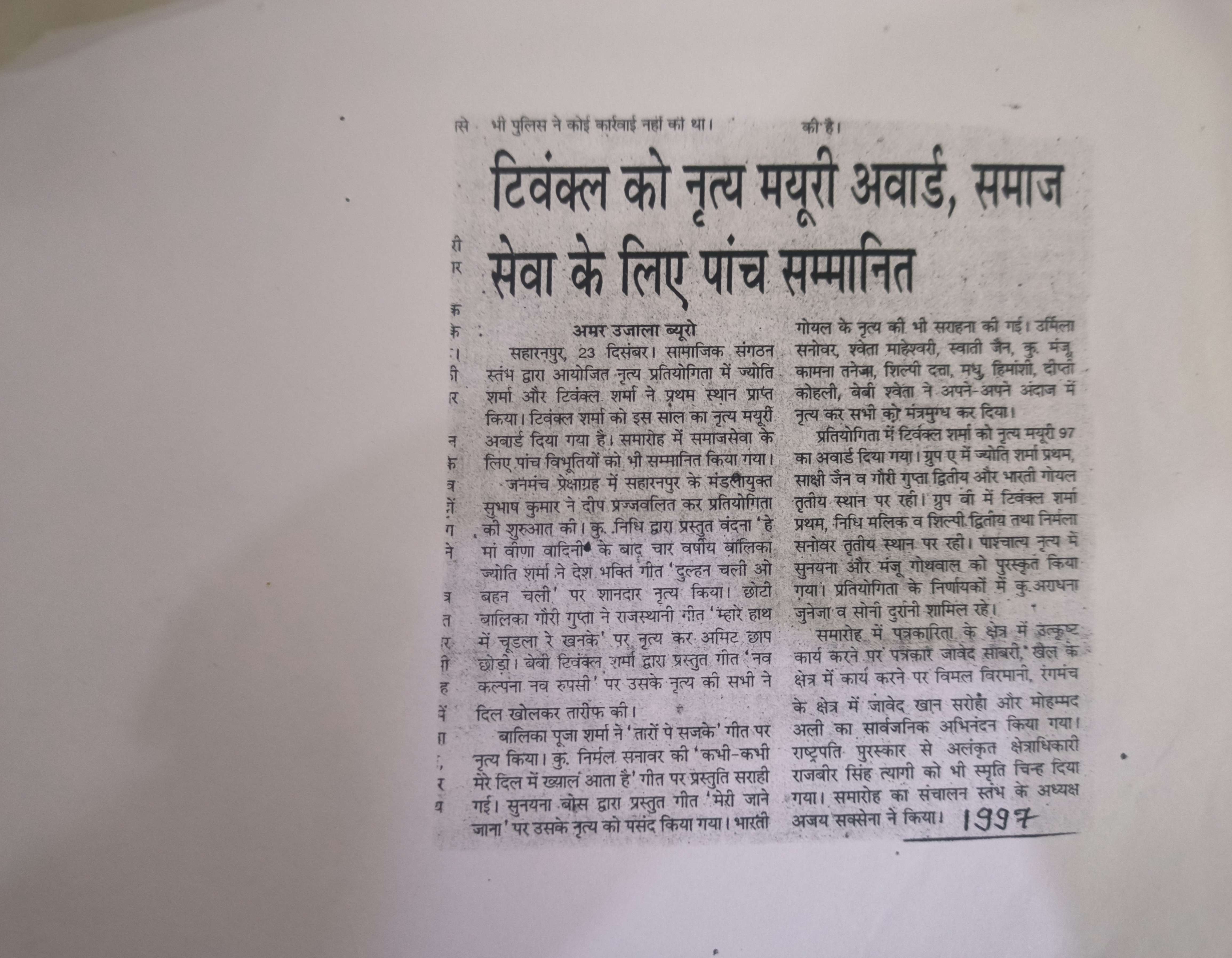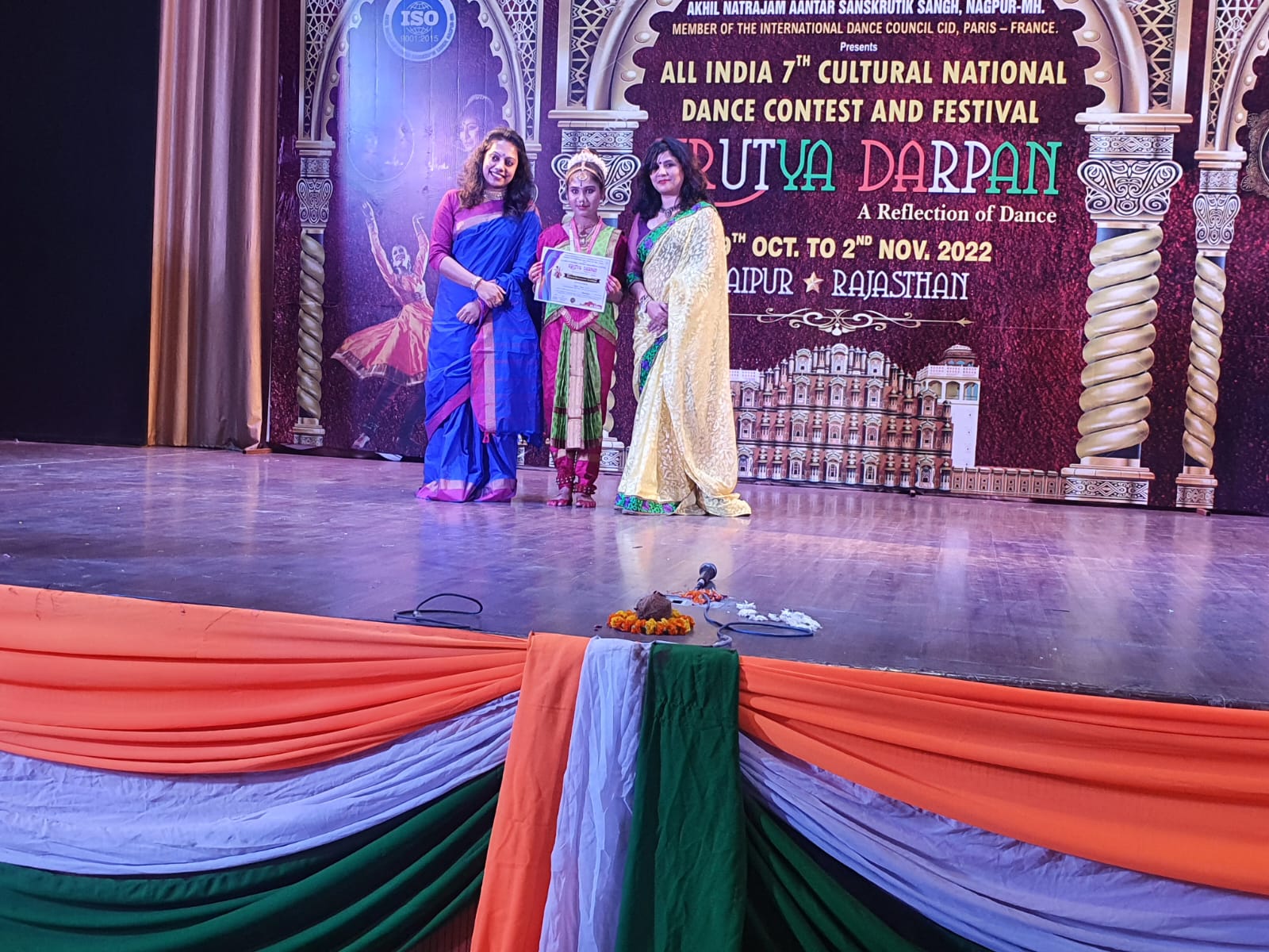 In November 2022, I was deeply honored to receive the prestigious Nritya Guru Varya Award at the renowned Nritya Darpan (A Reflection of Dance) festival held in Jaipur. This esteemed recognition was presented by Akhil Natarajam Aantar Sanskrutik Sangh, a proud member of the International Dance Council (CID), Paris, France, in acknowledgment of my unwavering commitment to the art of dance and my leadership in preserving and promoting its cultural significance. As part of this distinguished event, I had the privilege of serving as a judge for multiple dance categories, including Bollywood, Hip-Hop, Contemporary, and Indian Folk. This opportunity allowed me to celebrate the diversity of both global and Indian dance forms, fostering innovation and artistry among talented performers. This accolade stands as a testament to my dedication and expertise as a cultural ambassador. It reflects my lifelong passion for the transformative power of dance—a unifying art form that transcends boundaries and celebrates the richness of humanity's artistic heritage.