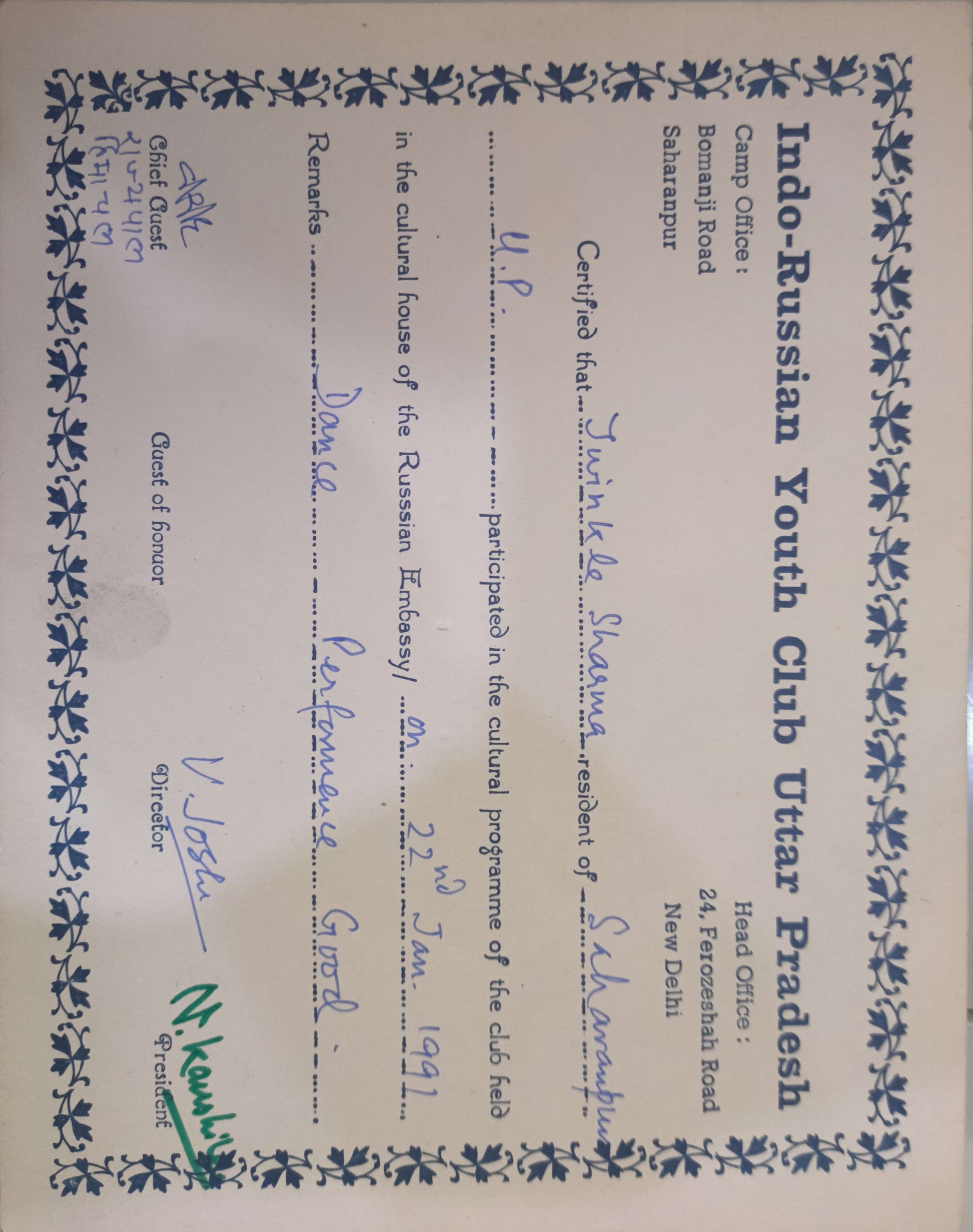 One of the most unforgettable milestones of my life took place in the year 1989, when I had the extraordinary opportunity to perform an Indian cultural dance in front of none other than Mikhail Gorbachev, the then President of the USSR, at the Indo-Russian Embassy. What made this moment even more special was that I was just 14 years old, a young girl from the small city of Saharanpur, Uttar Pradesh, stepping onto an international stage. Coming from a humble background, this achievement was a testament to the power of dreams, hard work, and the unyielding support of my mentors and family. Performing at such a prestigious event and being acknowledged for showcasing the essence of Indian culture to a global leader was a profoundly humbling experience. It wasn't just a dance performance—it was a celebration of India's rich heritage, bridging cultures, and creating a moment of harmony between two great nations. This experience instilled in me a deep sense of pride in my cultural roots and a commitment to using art as a means of connection and unity. Even decades later, I cherish this achievement as a defining moment that shaped my journey as an artist and as an individual. Looking back, it feels surreal to have had the honor of representing my country at such a young age and contributing to the cultural dialogue between India and Russia. This moment remains etched in my heart as a beacon of inspiration and proof that no dream is too big, no matter where you come from.